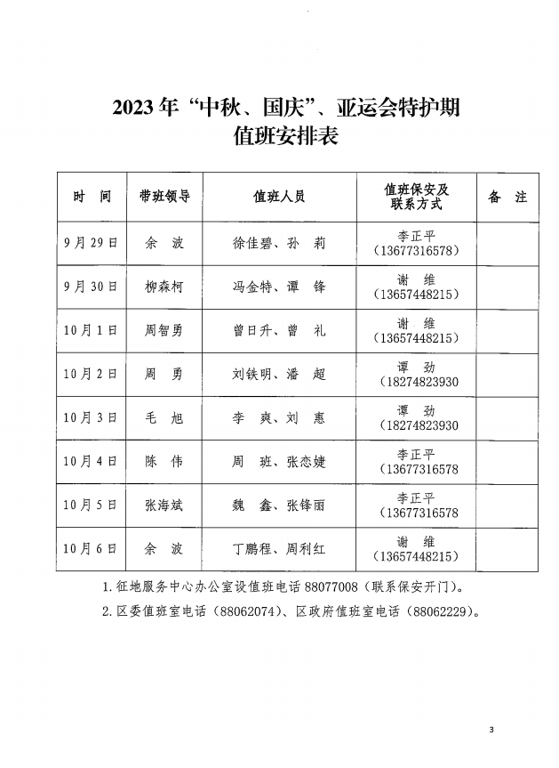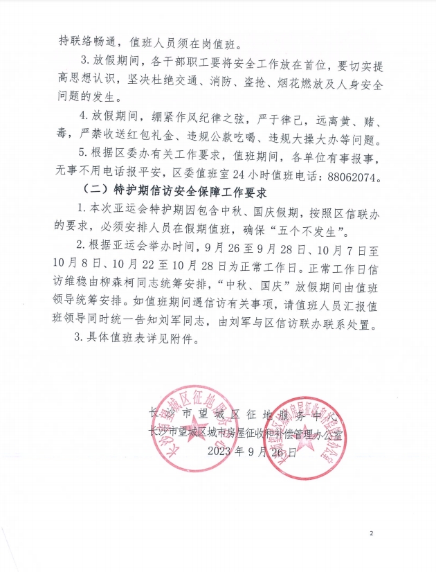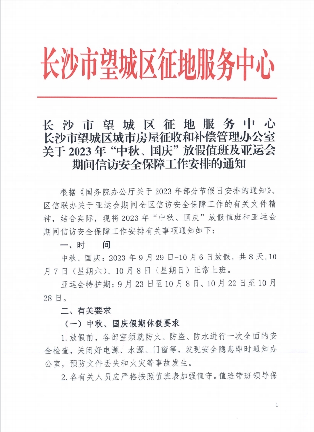 關(guān)于2023年“中秋、國慶”放假值班及亞運會期間信訪安全保障工作安排的通知