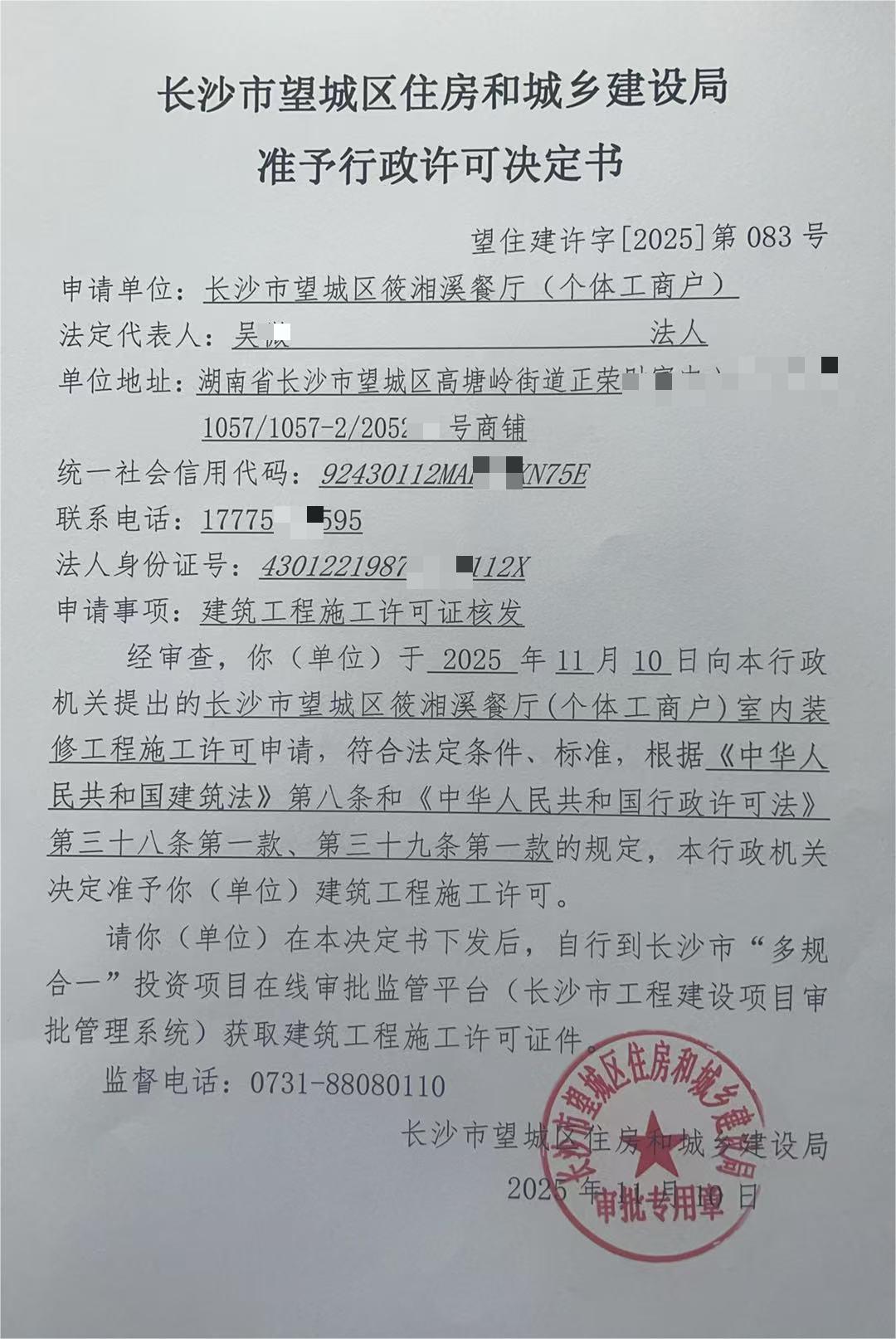 長沙市望城區筱湘溪餐廳(個體工商戶)室內裝修工程施工許可