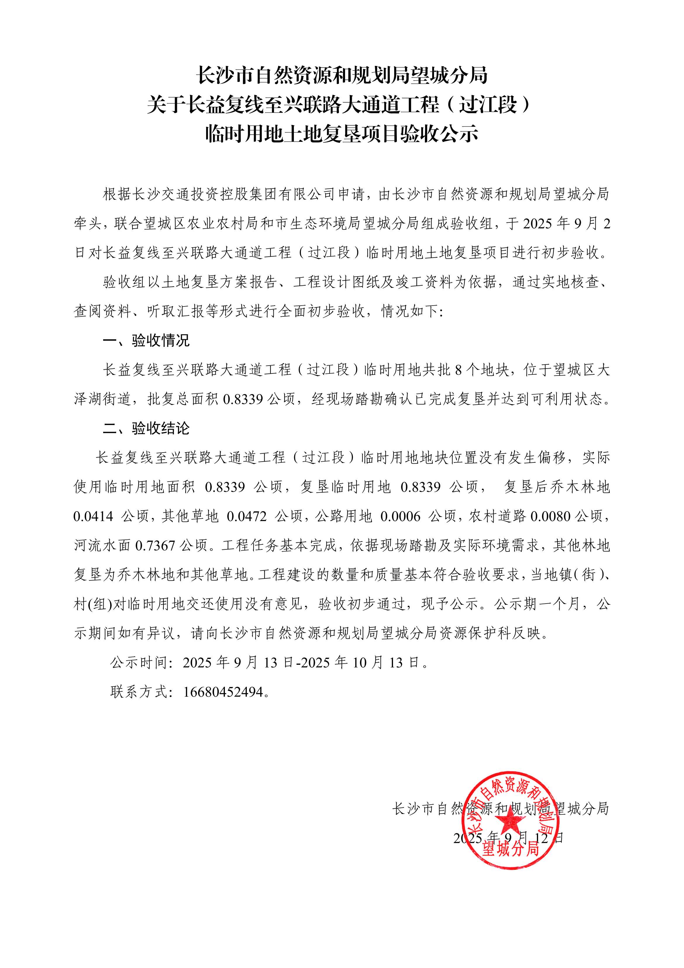 長沙市自然資源和規劃局望城分局 關于長益復線至興聯路大通道工程(過江段) 臨時用地土地復墾項目驗收公示