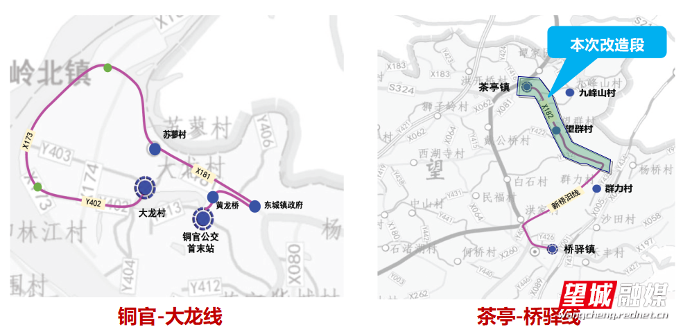 銅官-大龍線:線路主要為大龍村和蘇蓼村提供公交出行服務(wù),線路走向?yàn)殂~官公交首末站-X181-X173-Y402-大龍,線路全長(zhǎng)約14.43千米(已扣除花果路跨黃龍河橋段)。