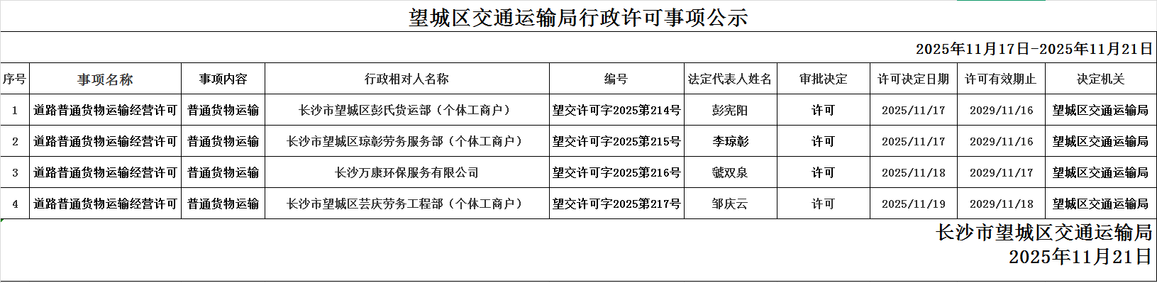 望城區交通運輸局行政許可事項公示(2025年11月17日-11月21日)
