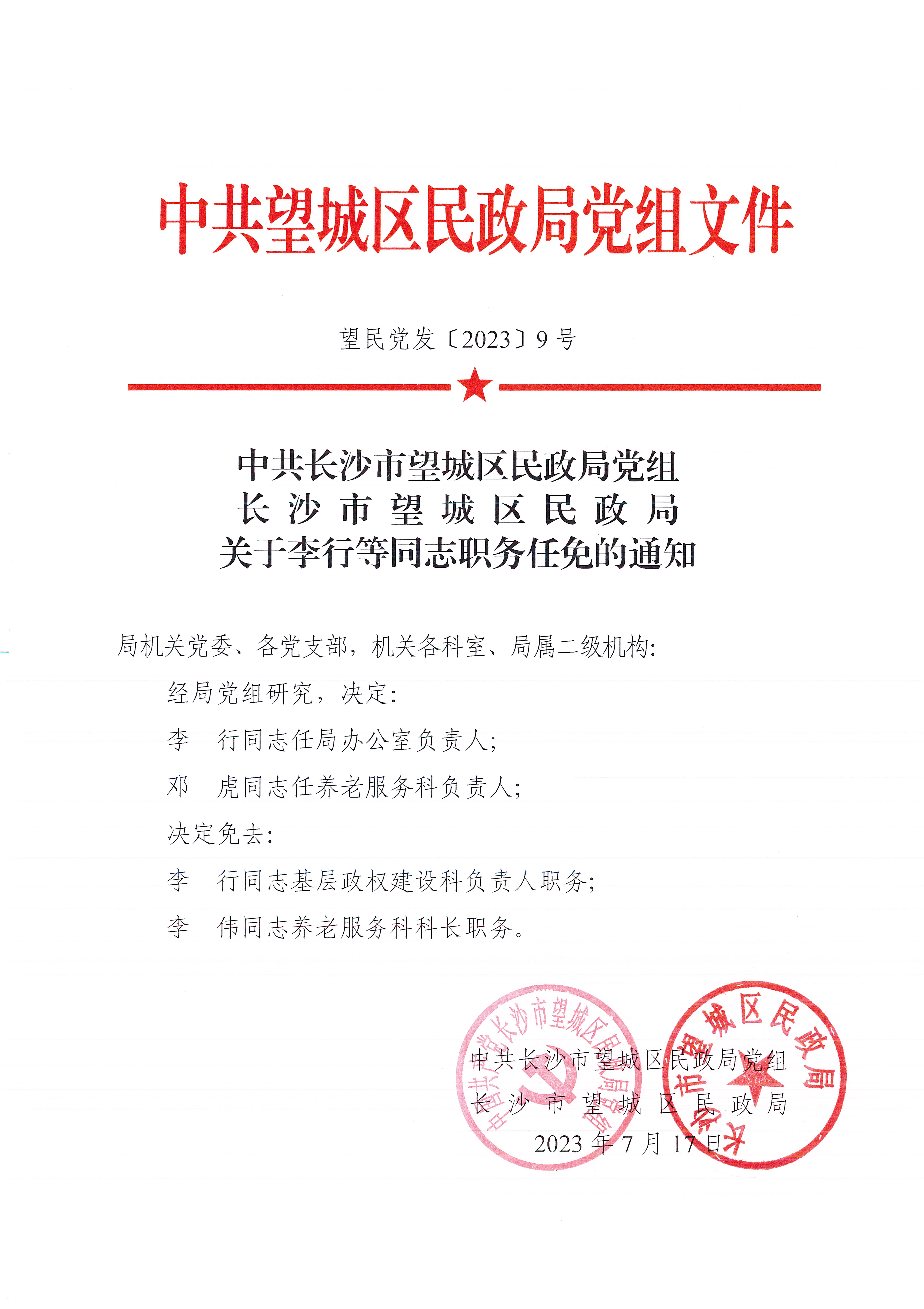 中共長沙市望城區民政局黨組長沙市望城區民政局關于李行等同志職務任免的通知