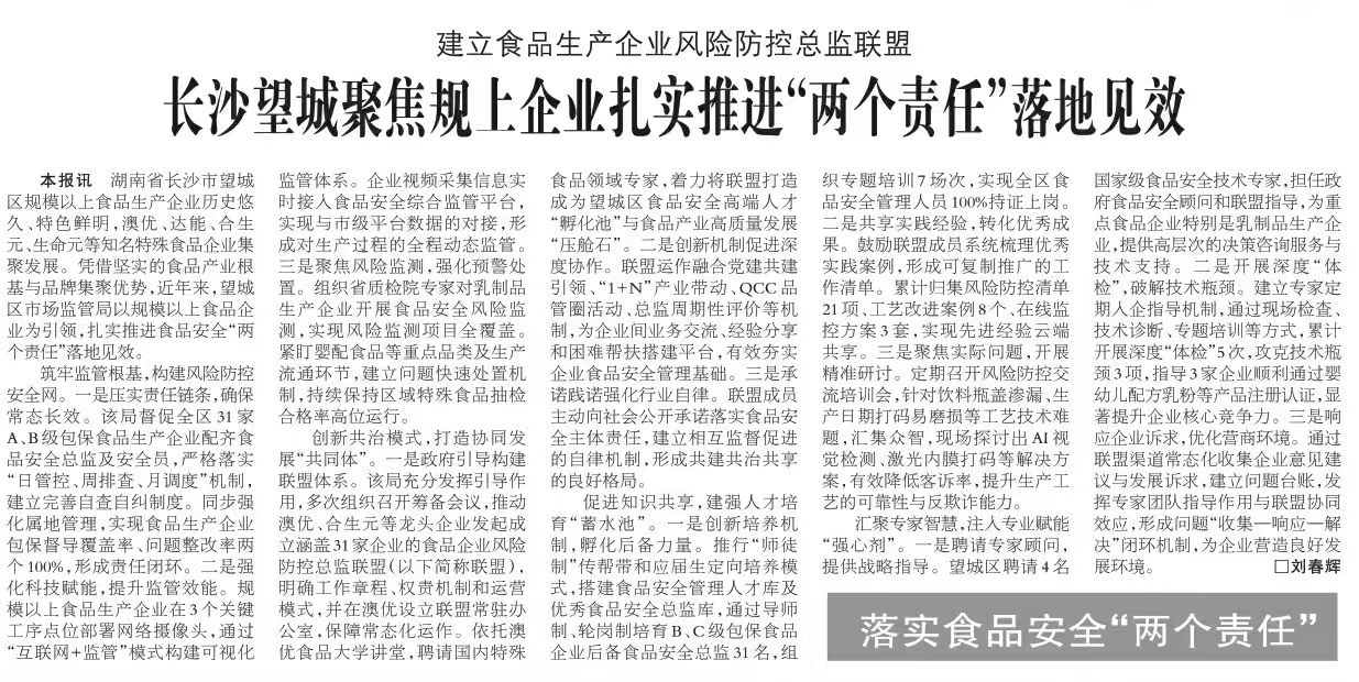 望城區規模以上食品生產企業歷史悠久、特色鮮明,澳優、達能、合生元、生命元等知名特殊食品企業集聚發展。憑借堅實的食品產業根基與品牌集聚優勢,近年來,望城區市場監管局以規模以上食品企業為引領,扎實推進食品安全“兩個責任”落地見效。我局探索的“食品企業風險防控總監聯盟”,通過筑牢監管根基、創新共治模式,促進知識共享,匯聚專家智慧,構建起食品生產企業風險防控的安全網和協同共進的發展平臺。這一探索以制度創新激發治理效能,將監管、服務與發展深度融合,為望城區食品產業筑牢了安全根基,也為高質量發展注入了可持續的內生動力。