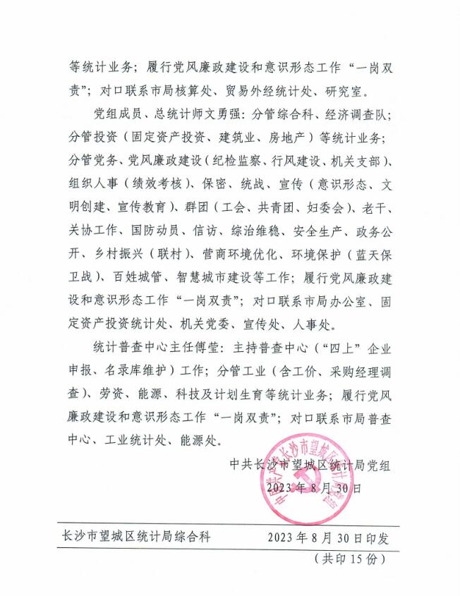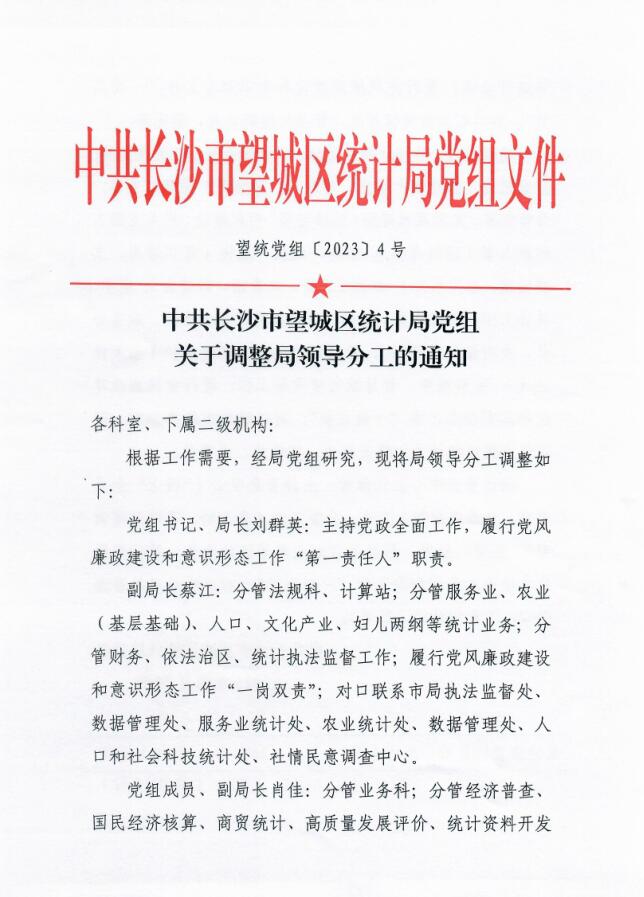 中共長沙市望城區統計局黨組關于調整局領導分工的通知