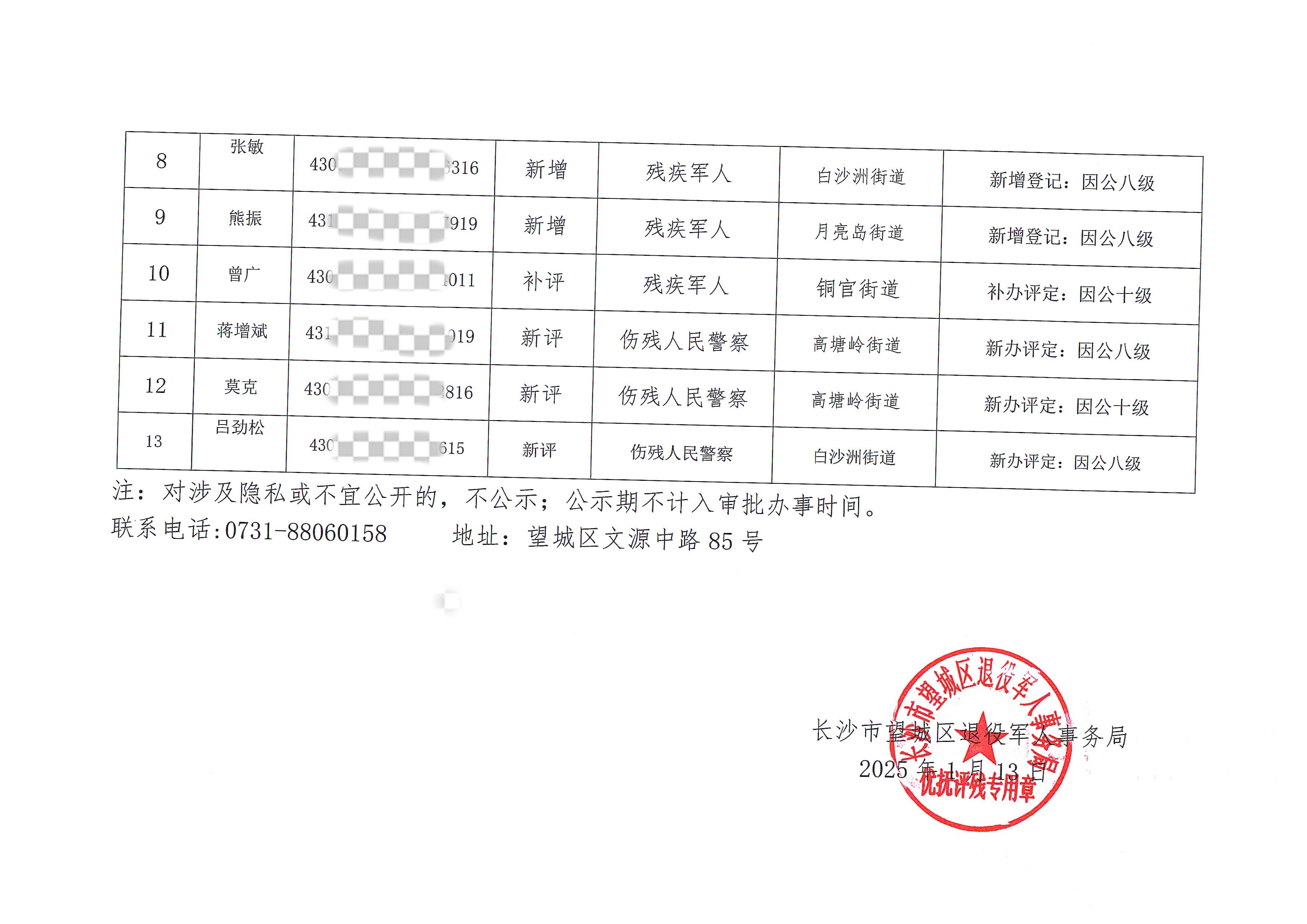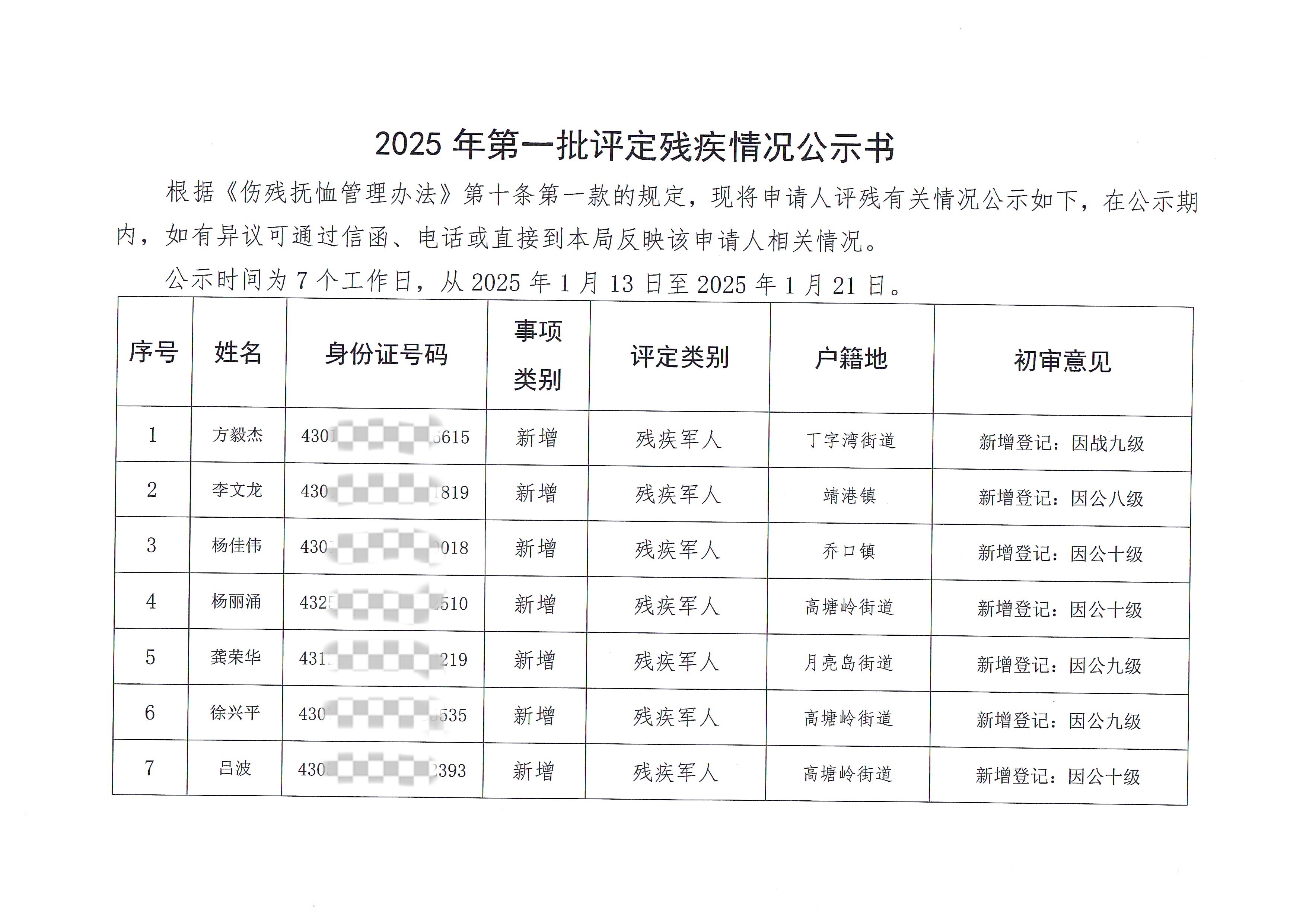2025年第一批評定殘疾情況公示書