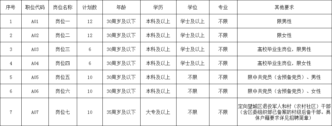1. 年齡要求:崗位A01、A02、A03、A04、A05、A06考生要求30周歲及以下(1994年6月11日及以后出生);崗位A07考生要求35周歲及以下(1989年6月11日及以后出生)。