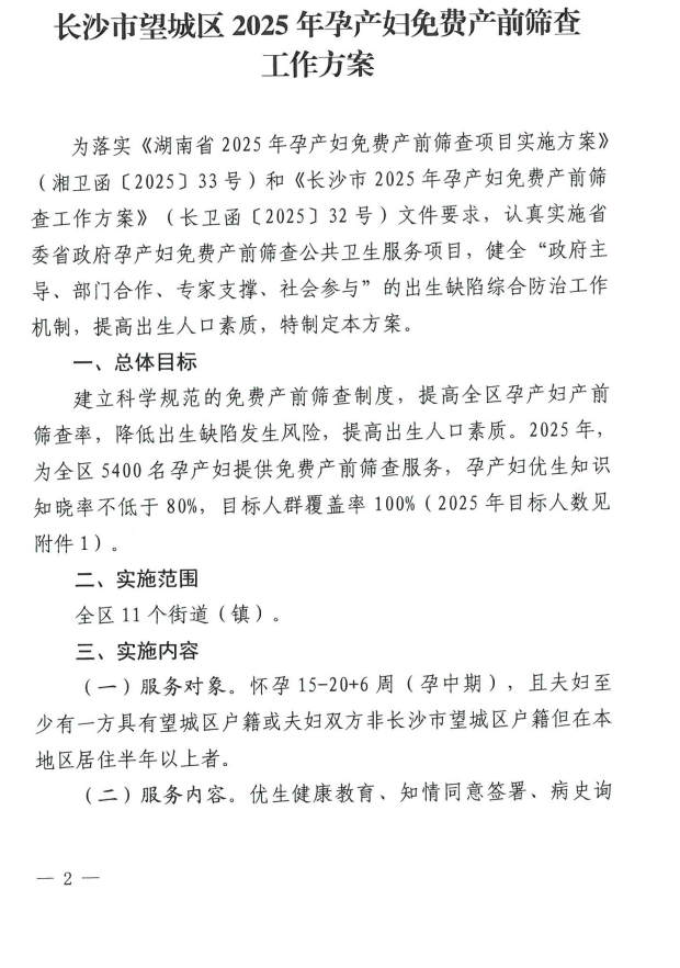 關于印發《長沙市望城區2025年孕產婦免費產前篩查工作方案》的通知