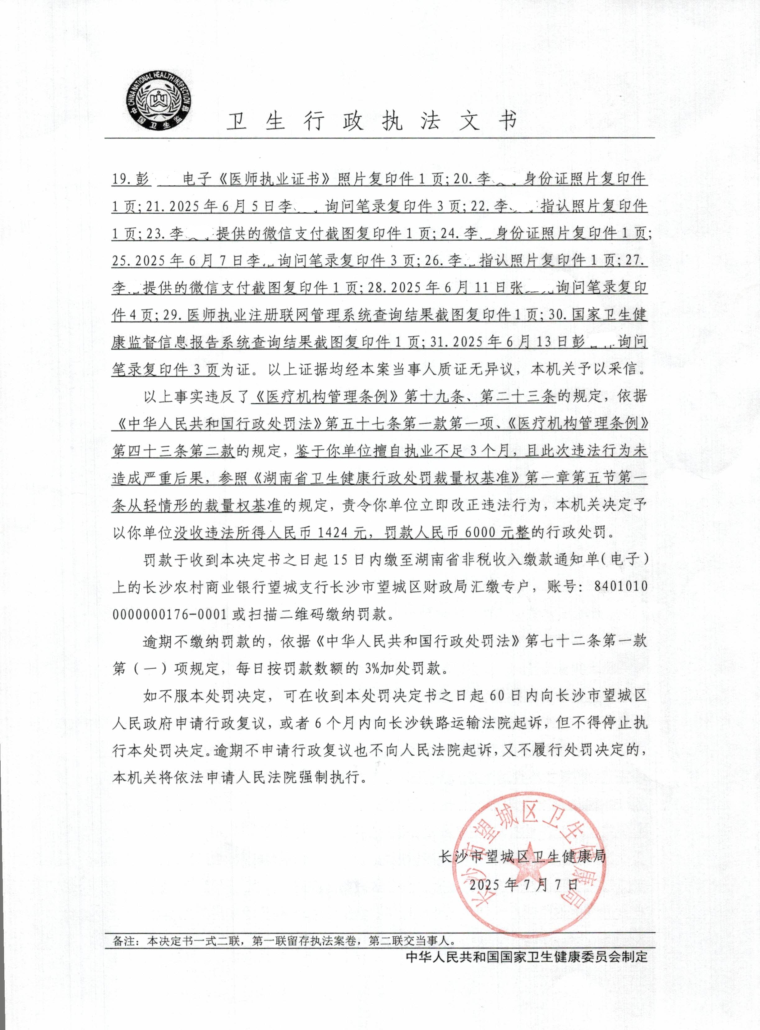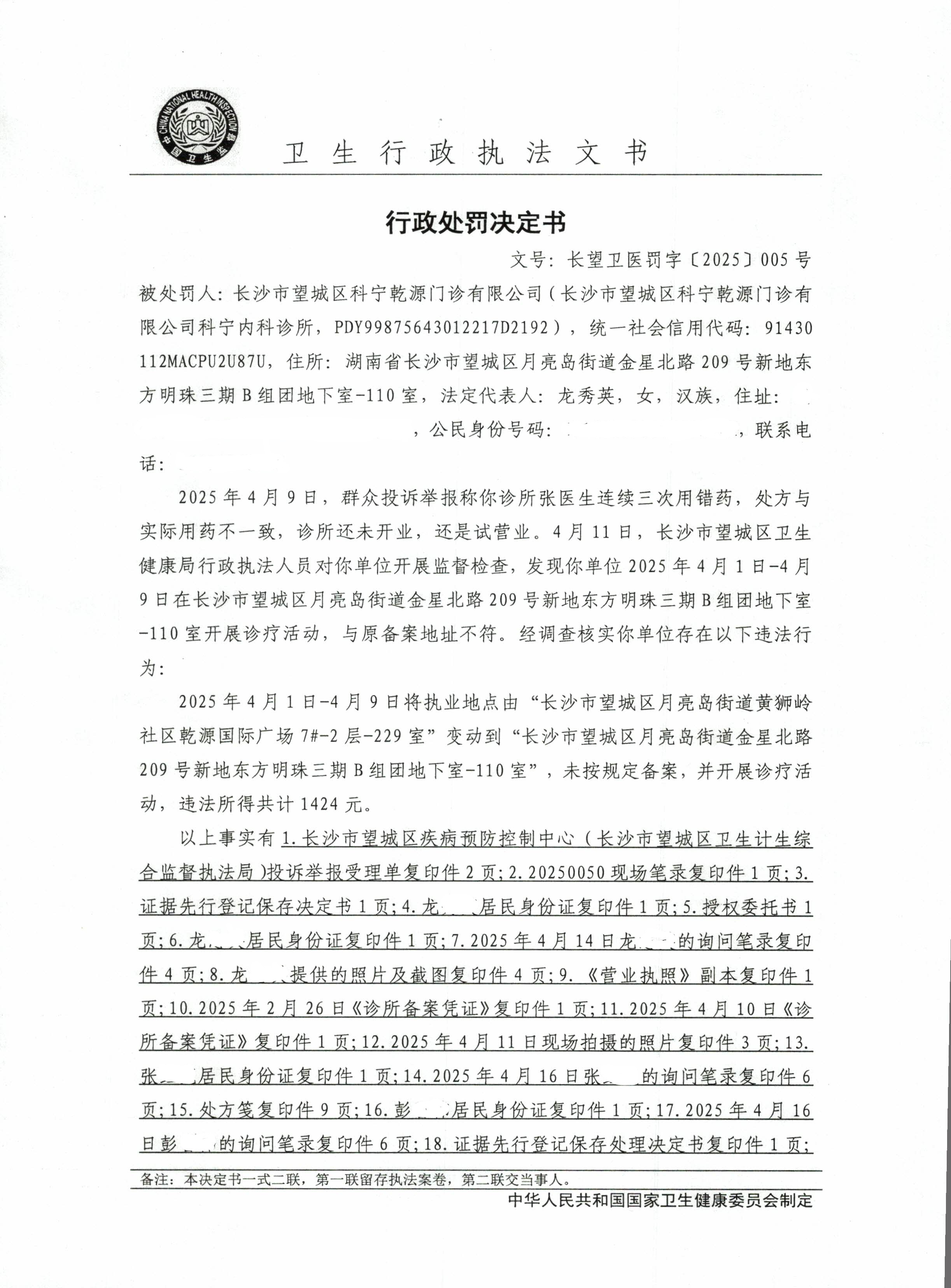 長沙市望城區衛生健康局關于對長沙市望城區科寧乾源門診有限公司的行政處罰決定書