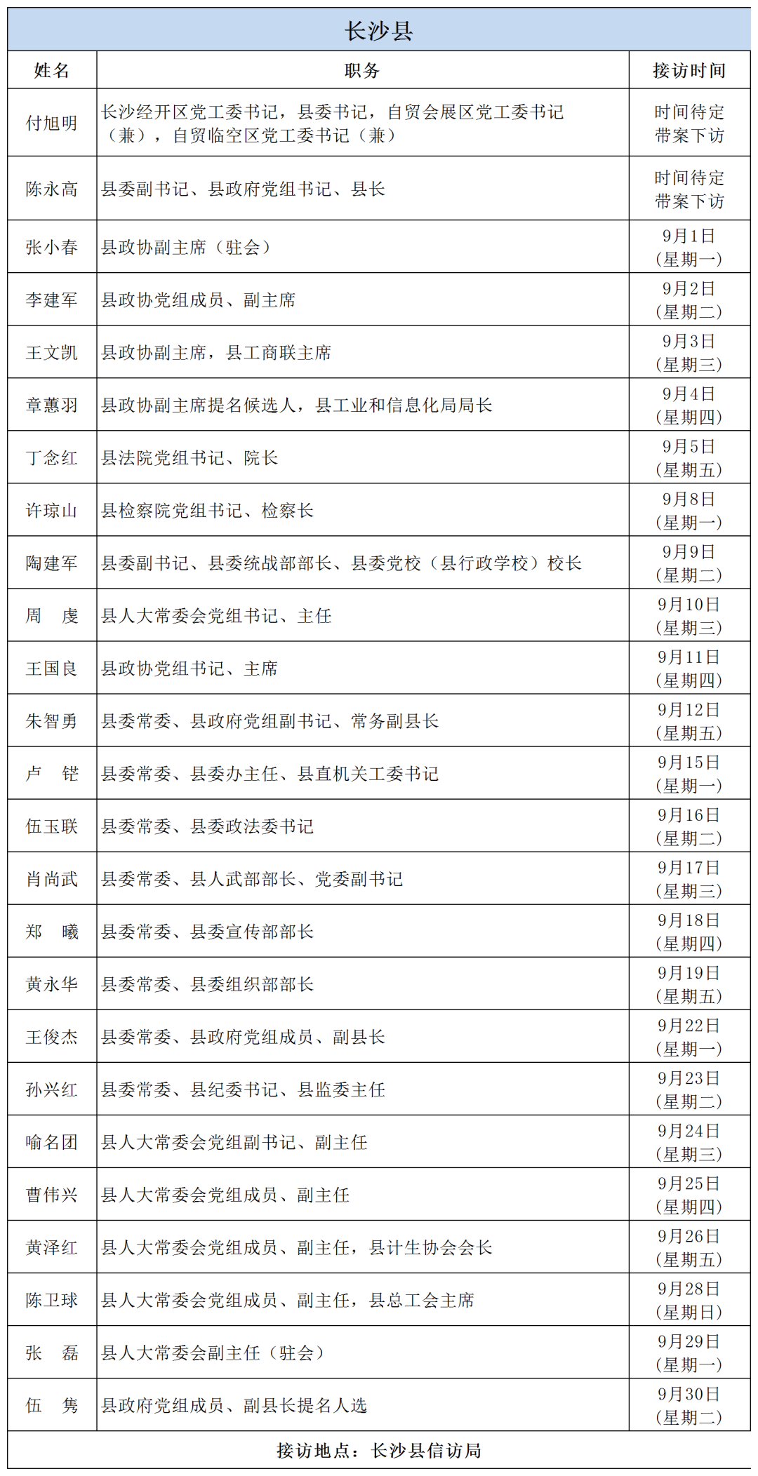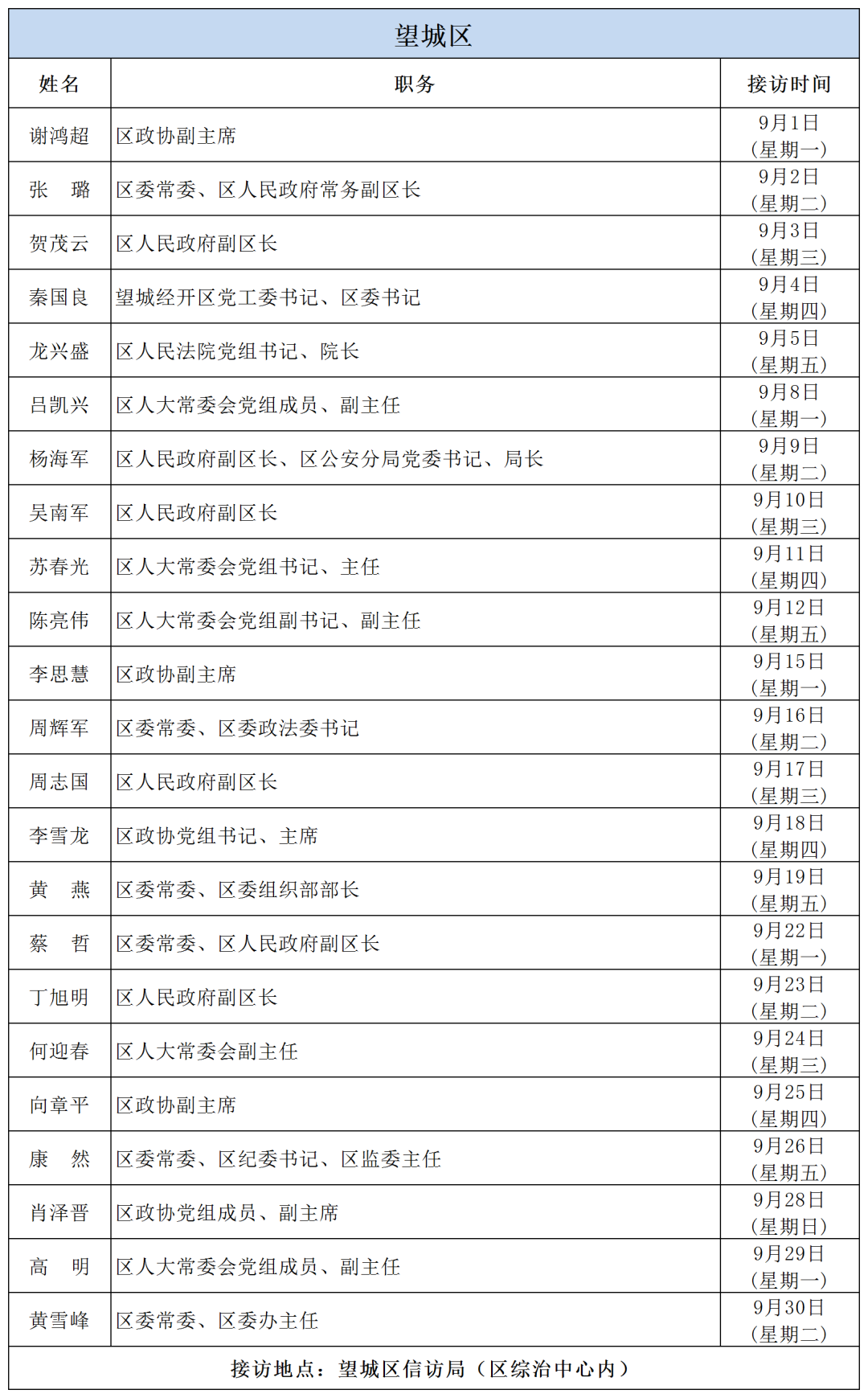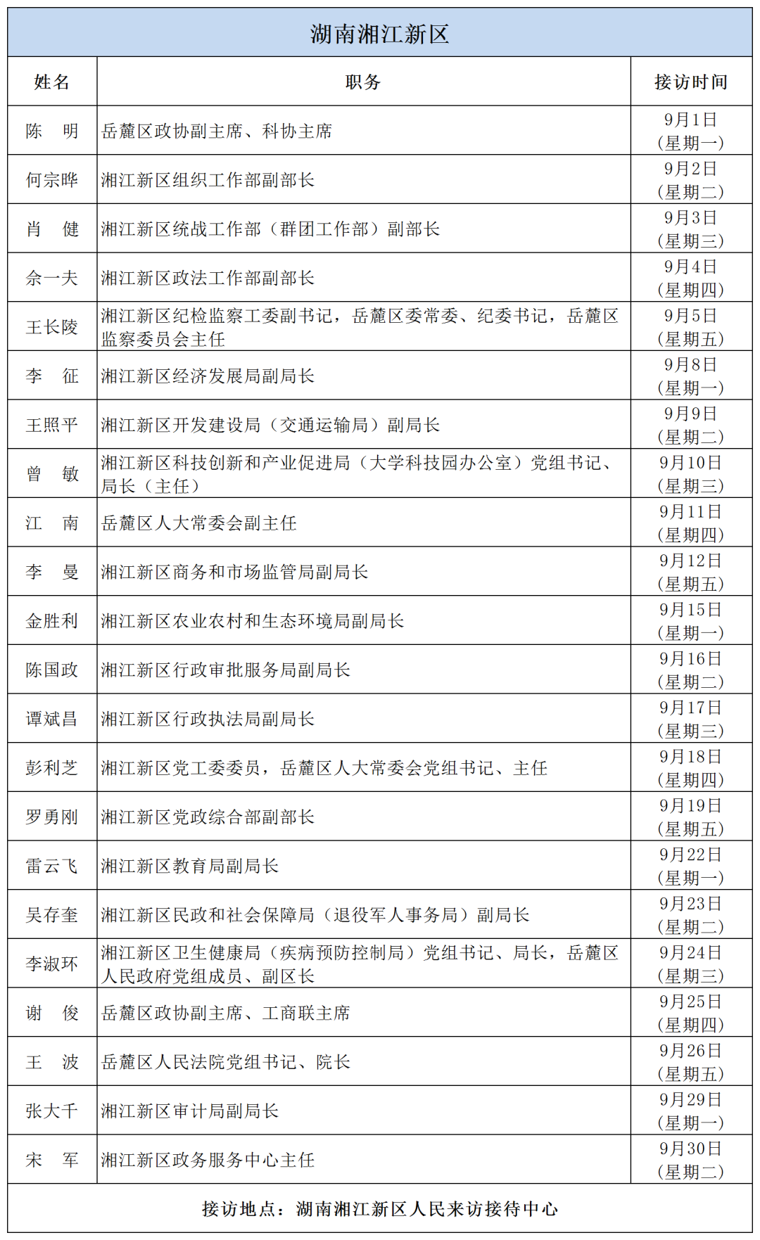 公告 | 2025年9月份湖南湘江新區、各區縣(市)及相關市直單位(企業)領導接訪安排