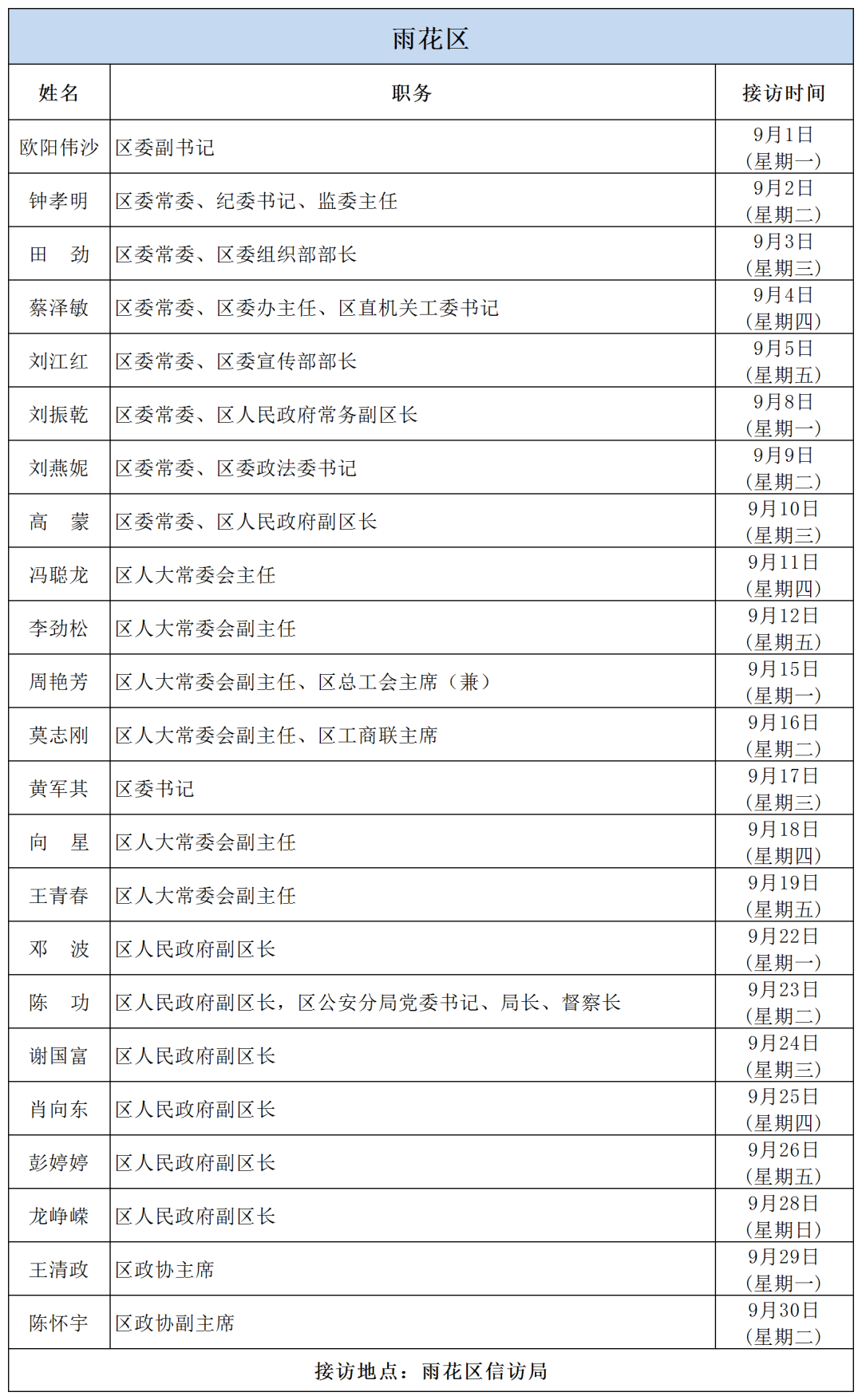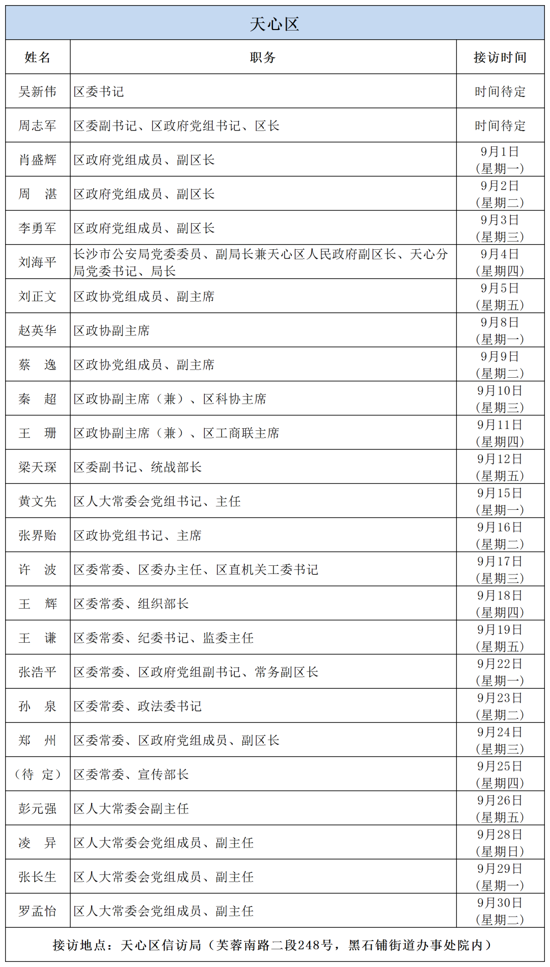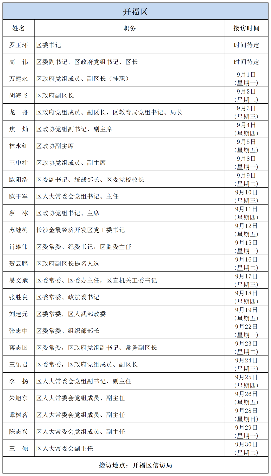 公告 | 2025年9月份湖南湘江新區、各區縣(市)及相關市直單位(企業)領導接訪安排