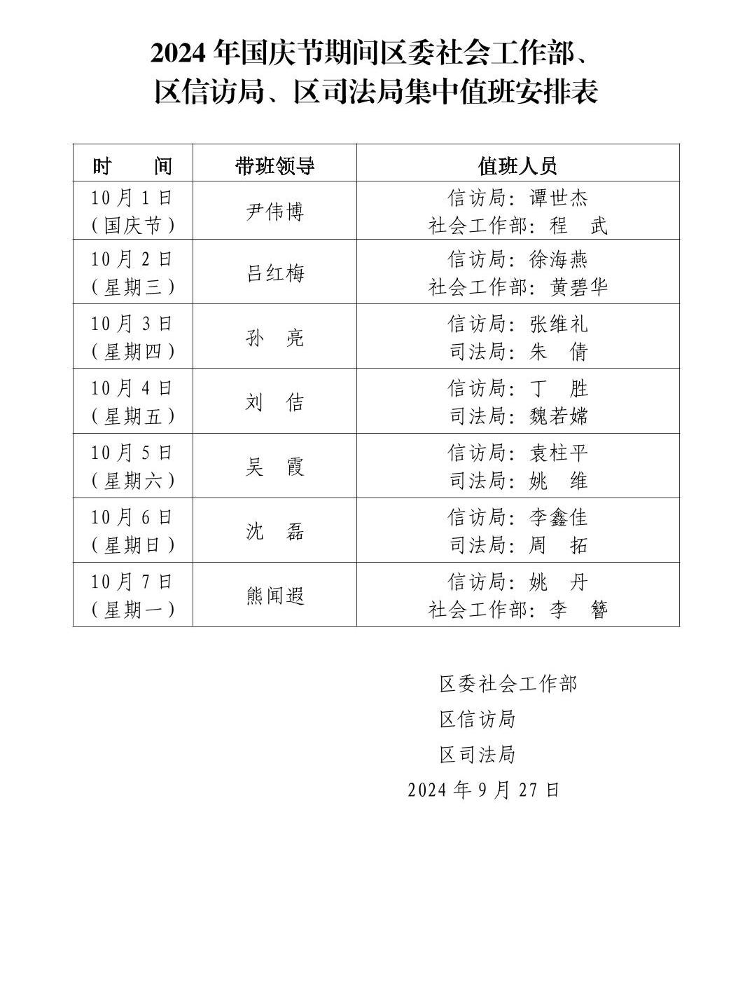 2024年國慶節期間區委社會工作部、區信訪局、區司法局集中值班安排表