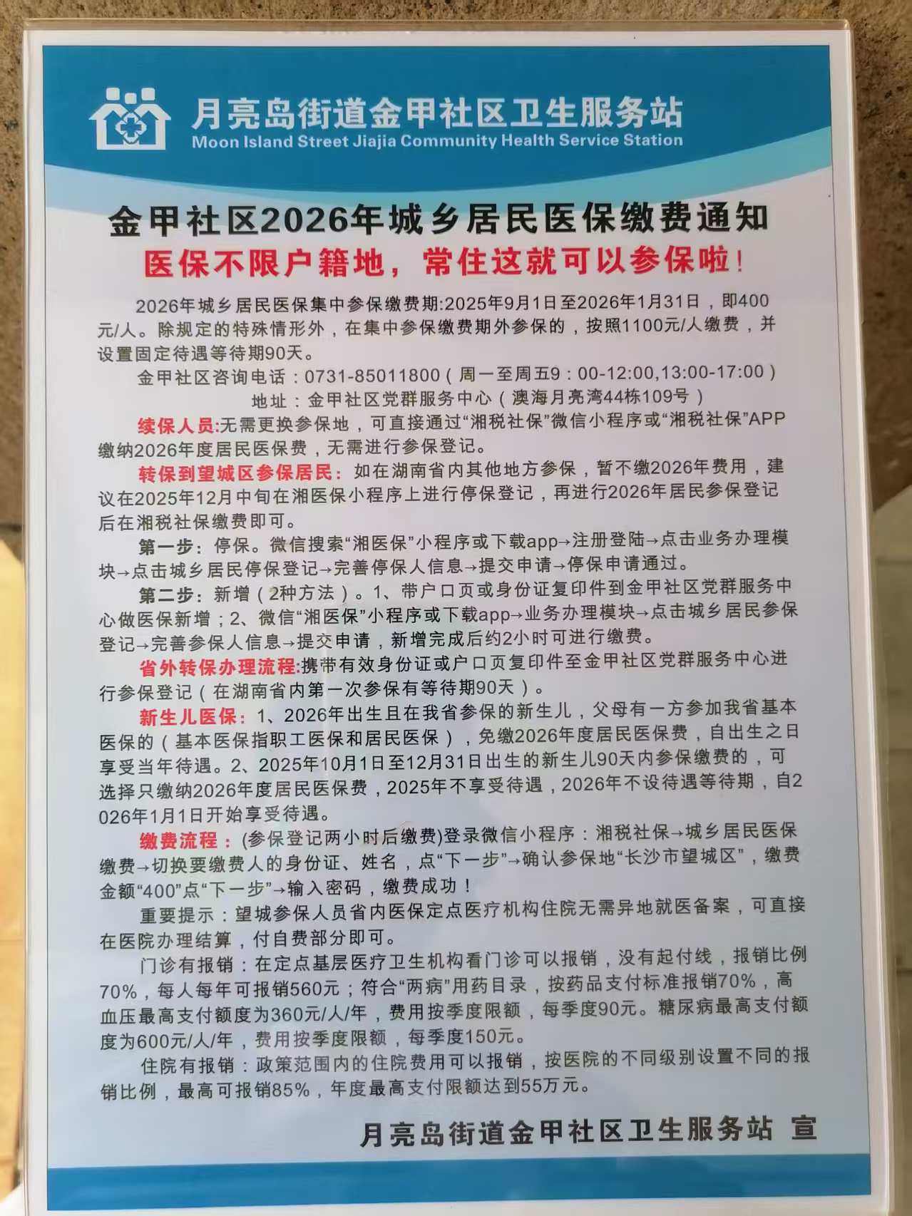 為扎實做好2026年度居民醫保參保繳費宣傳工作,確保惠民政策精準傳達、深入人心,近日,望城區醫保局領導班子帶隊前往望城區各鎮(街道)調研居民醫保參保繳費工作,深入了解參保繳費宣傳工作具體做法及相關經驗。據了解,為強化醫保宣傳工作,月亮島街道金甲社區衛生服務站主動出擊、勇于探索、大膽創新,構建了“多方位、精準化、接地氣”立體宣傳矩陣,有力推動了醫保參保繳費工作。