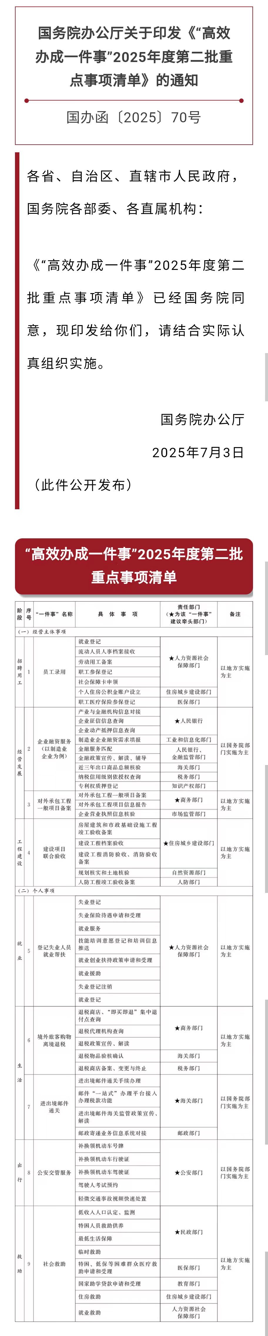國務(wù)院辦公廳關(guān)于印發(fā)《“高效辦成一件事”2025年度第二批重點事項清單》的通知