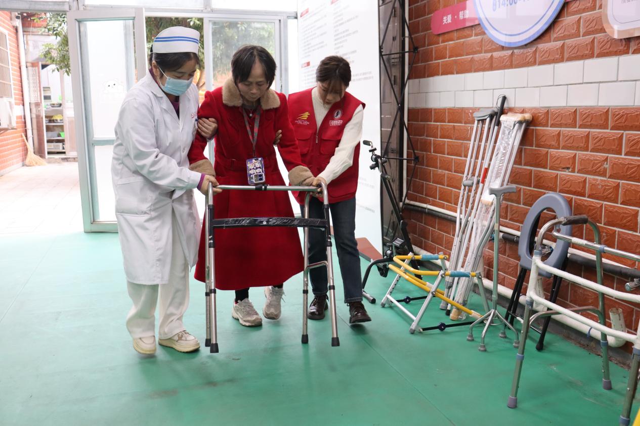 共建單位醫生、黨員志愿者在社區康復站內幫助殘障居民進行康復訓練。
