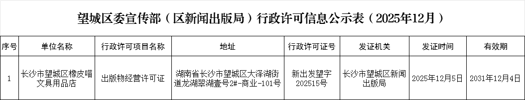 望城區委宣傳部(區新聞出版局)行政許可信息公示表(2025年12月)