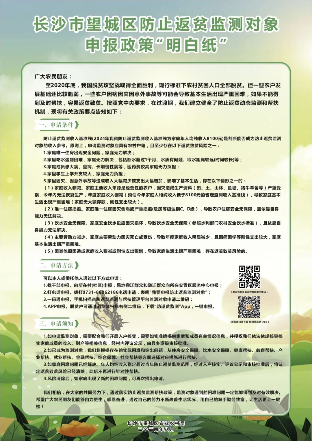 2.打電話申報。撥打0731-88062186電話申請,表明“我要申報防止返貧監測對象”;